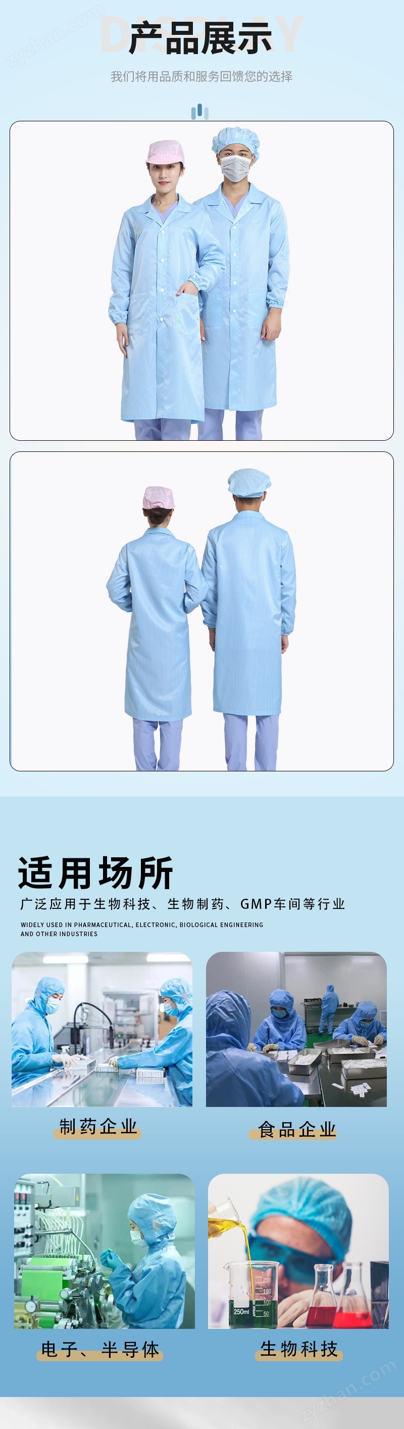 本品采用1/2斜0.5条纹防静电面料防静电面料;防静电效果佳,松紧用优质钩编松紧,耐反复水洗高温湿热灭菌。